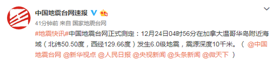 中国地震台网正式测定:12月24日04时56分在加拿大温哥华岛附近海域(北纬50.50度,西经129.66度)发生6.0级地震,震源深度10千米。