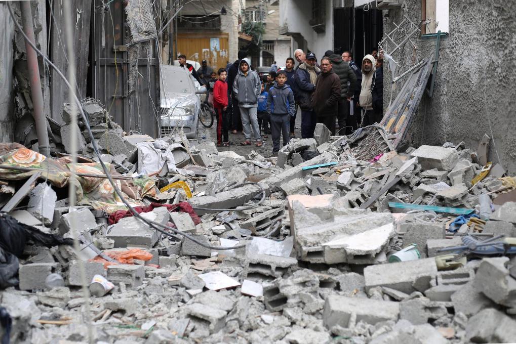 1月14日,在加沙地带中部城市代尔拜拉赫,人们从损毁的建筑前走过。新华社发(里泽克·阿卜杜勒贾瓦德摄)