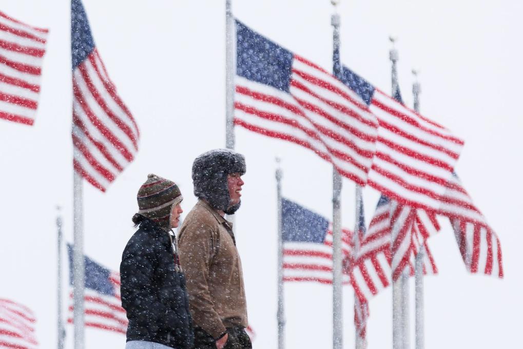 1月15日,在美国首都华盛顿,两名行人冒雪在国家广场散步。新华社发(阿伦摄)
