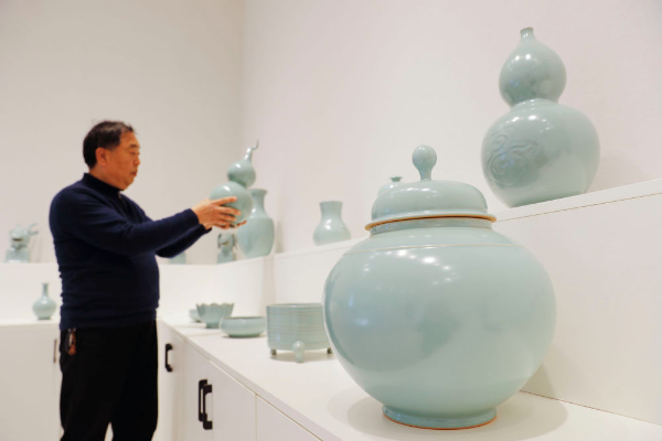 2021年1月19日,在河南省平顶山市宝丰县大营镇一家汝瓷作坊,国家级非物质文化遗产汝瓷烧制技艺代表性传承人王君子检查汝瓷作品。(新华社发)