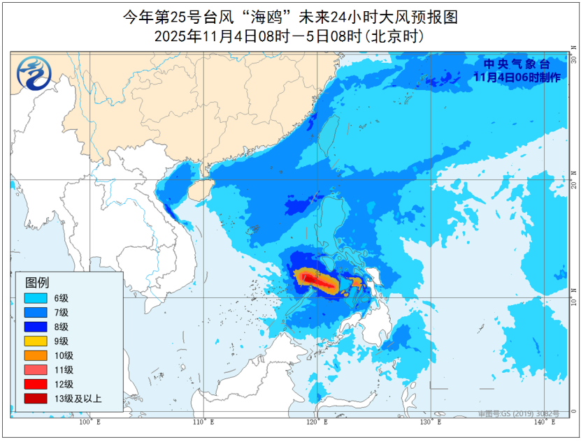 另外,今年第25号台风“海鸥”已于11月4日凌晨在菲律宾莱特岛沿海登陆,登陆时中心附近最大风力达14级(42米/秒)。登陆后“海鸥”减弱为台风级,今天早晨其中心位于菲律宾群岛中部地区,中心附近最大风力有13级(40米/秒)。