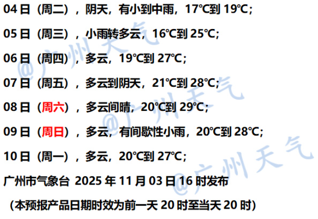广州市气象台预计,11月3日夜间—4日广州有小到中雨,气温17~19℃。气温全面下降到20℃以下,大家要注意适时添衣。11月5日白天起雨止转多云,气温回升。