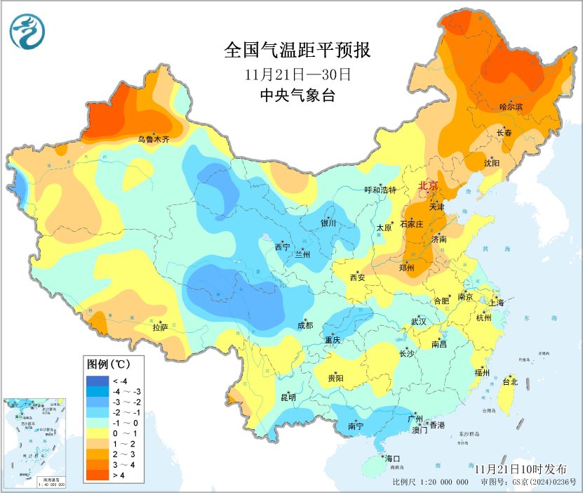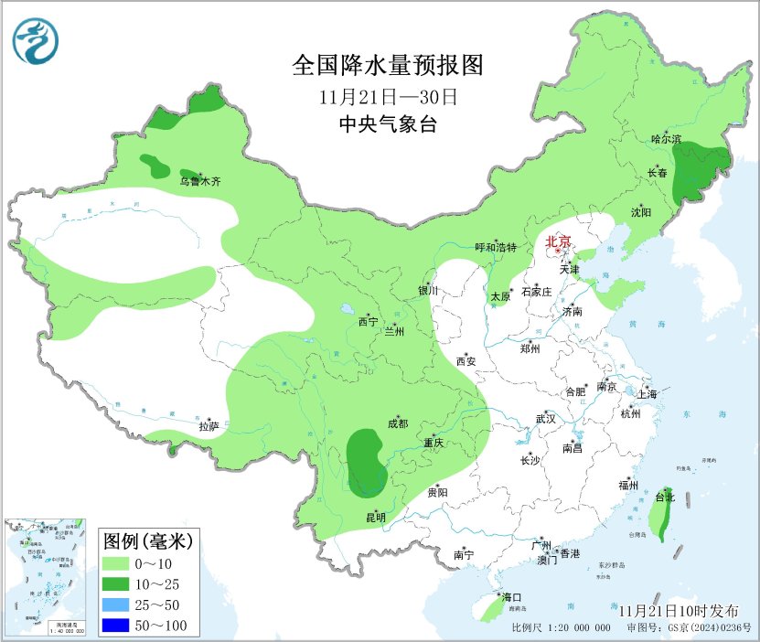 未来10天(11月21-30日),新疆北部、青藏高原东部、西北地区东部、华北北部及东北地区有1~5毫米降水,局地超过10毫米,西南部分地区有10~20毫米,中东部其他大部降水稀少。