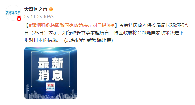 香港保安局局长邓炳强:特区政府将会跟随国家政策决定下一步对日本的措施