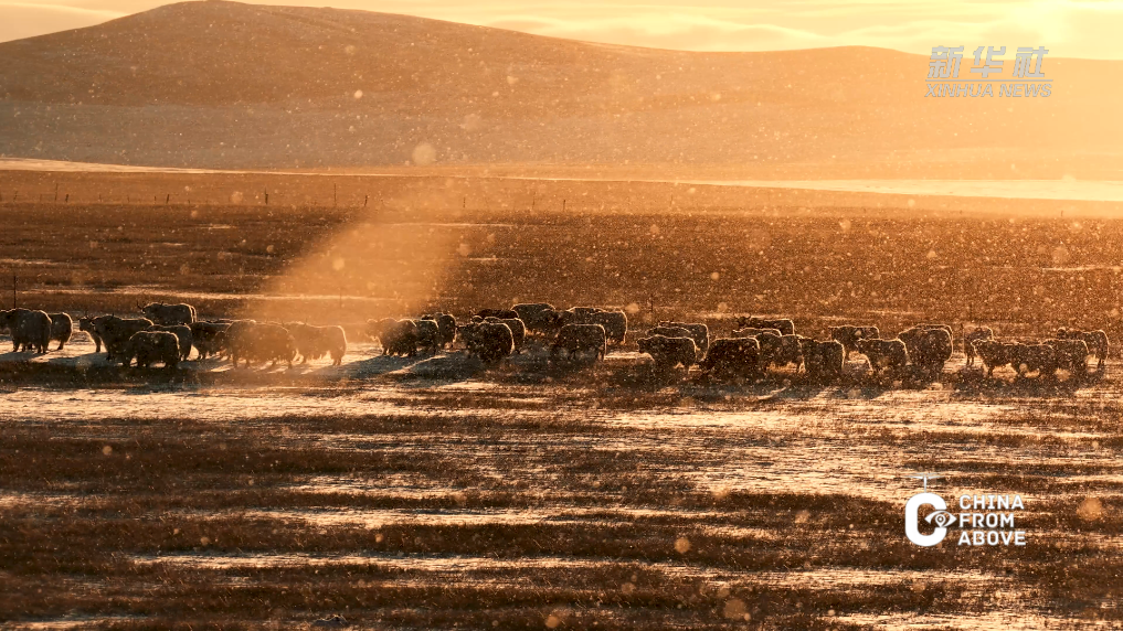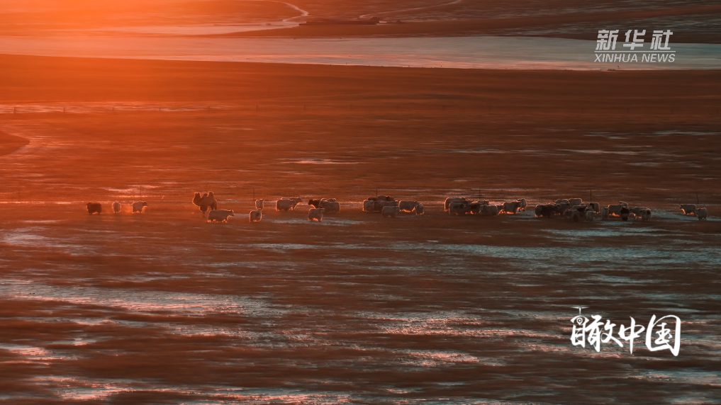 落日时分,余晖洒落,漫天雪花如碎金般飞舞。骆驼群沉稳徜徉,牦牛群悠闲食草,夕阳逆光中,它们的身影被镀上一层温暖的金边。雪原、生灵与落日相融,动静之间,勾勒出锡林郭勒草原浑厚又静谧的初冬画卷,尽显草原明珠的自然之美。