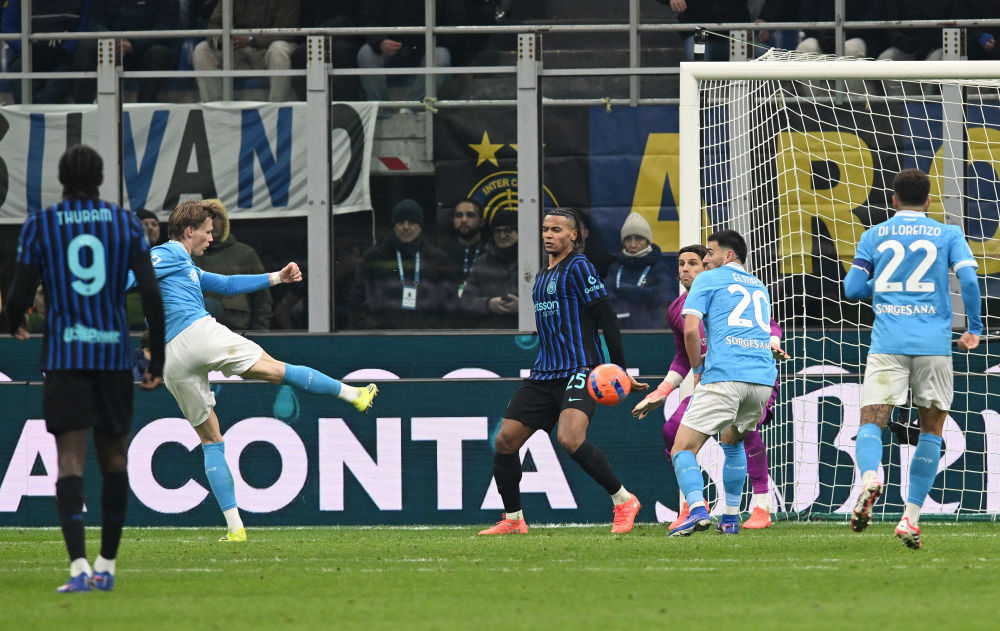 国米迎战那不勒斯,开局仅9分钟,图拉姆助攻迪马尔科小角度破门,为主队拔得头筹。那不勒斯在第28分钟扳平比分,麦克托米纳接埃尔马斯横传,门前抢点推射破门。