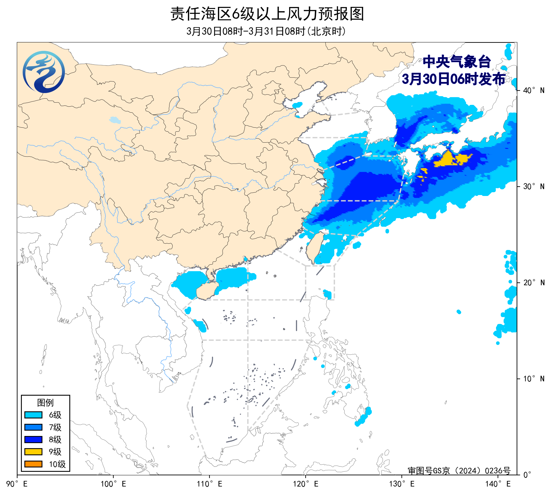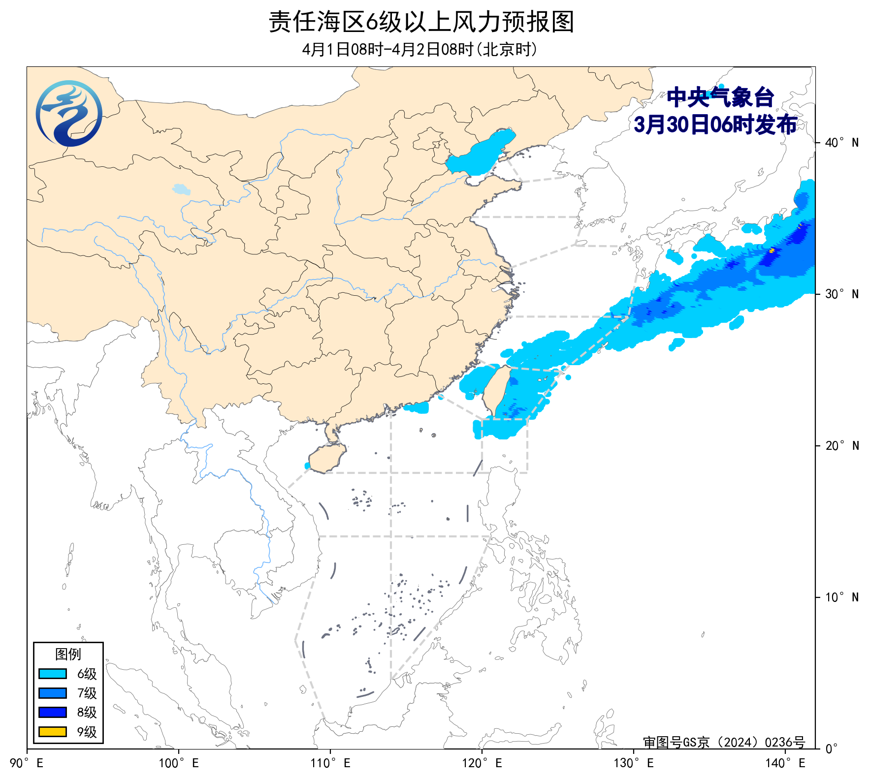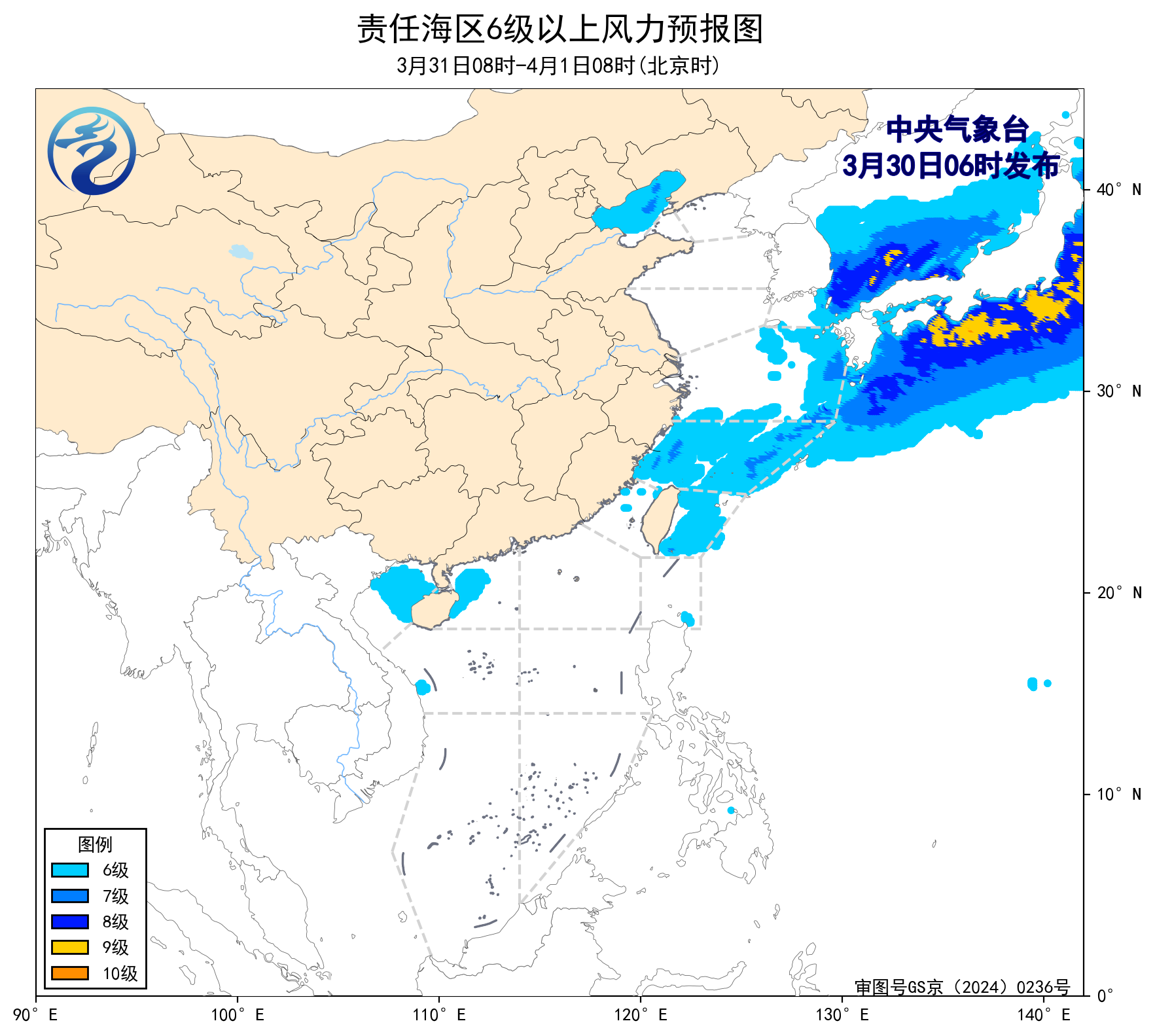 3月31日08时至4月1日08时,东海北部海域将有5~6级、阵风7级的偏西风,台湾以东洋面、北部湾将有5~6级、阵风7级的偏南风,渤海、东海南部海域将有5~6级、阵风7级的偏北到东北风。