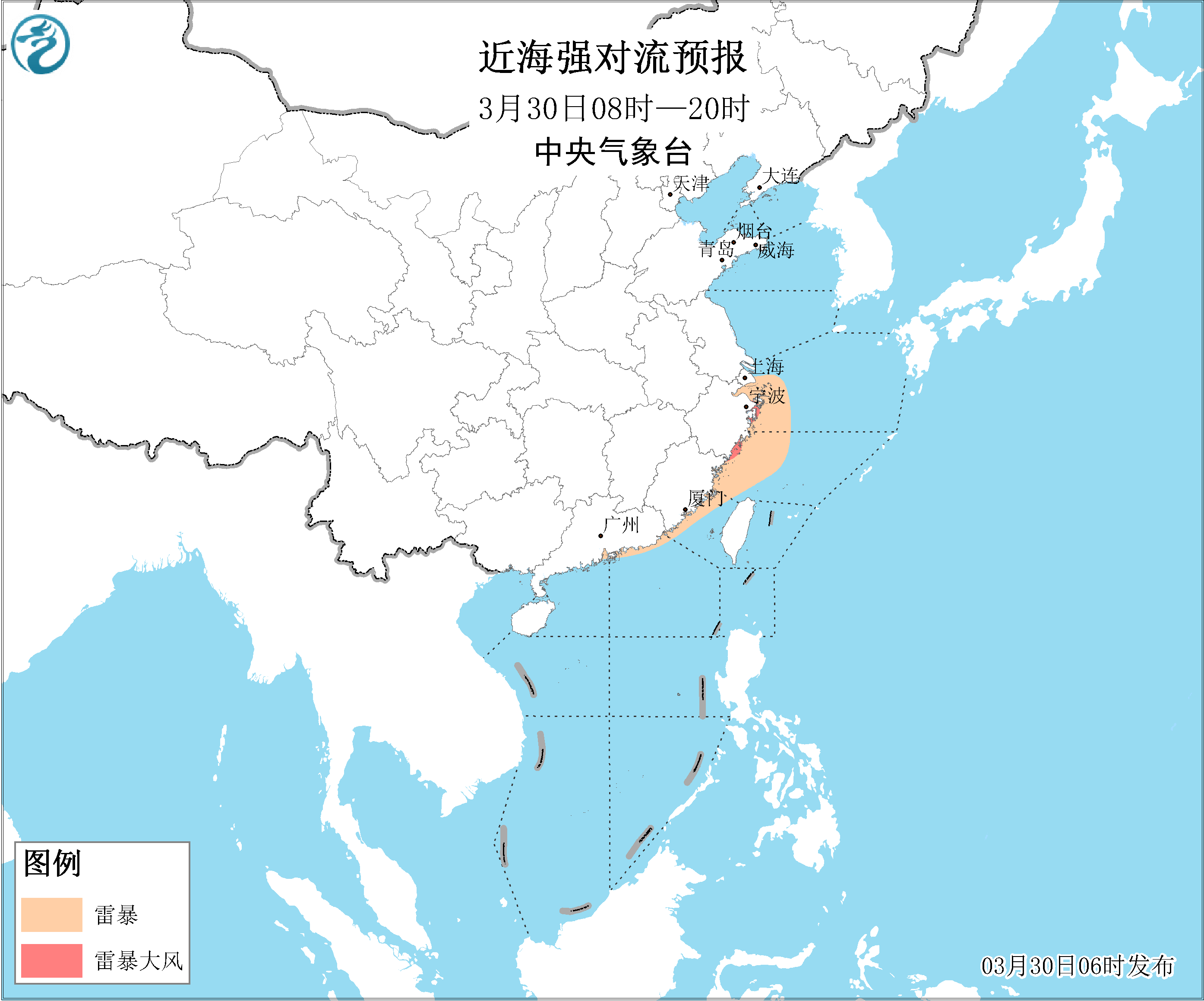 30日白天至夜间,黄海中部海域将有能见度不足1公里的大雾;30日早晨至上午,黄海南部海域、东海西部海域、江苏沿海、浙江沿海、福建北部沿海、长江口及杭州湾附近海域将有能见度不足1公里的大雾。30日08时至31日08时,黄海南部海域、东海大部海域将有6~7级、阵风8级增大到7~8级、阵风9~10级的大风,北部湾、南海西北部海域、台湾海峡、台湾以东洋面将有5~6级、阵风7级的偏南到西南风。30日白天,浙江沿岸海域将有8~10级的雷暴大风。