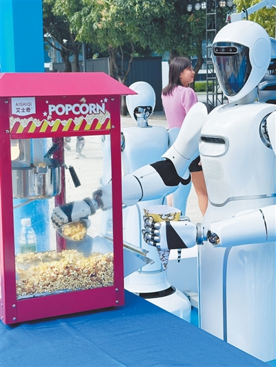 在广东佛山市一园区内,美的人形机器人“美拉”操作爆米花机,为园区员工提供服务。