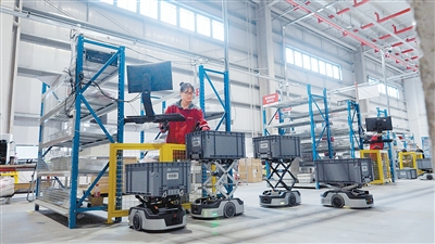 京东物流亚洲一号智能产业园的机器人正在搬运货物。