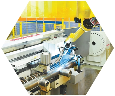浙江嘉兴经开区城南街道一家企业,机器人正在焊接马鞍形钢管构件。机器人的使用提升了生产效率,降低了人工焊接风险。