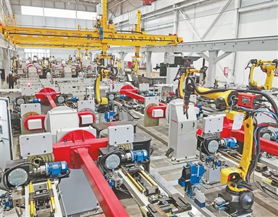 在湖南浏阳市一生产基地内,由交通银行授信支持的长沙华恒机器人系统有限公司自研生产的工业机器人正在作业。